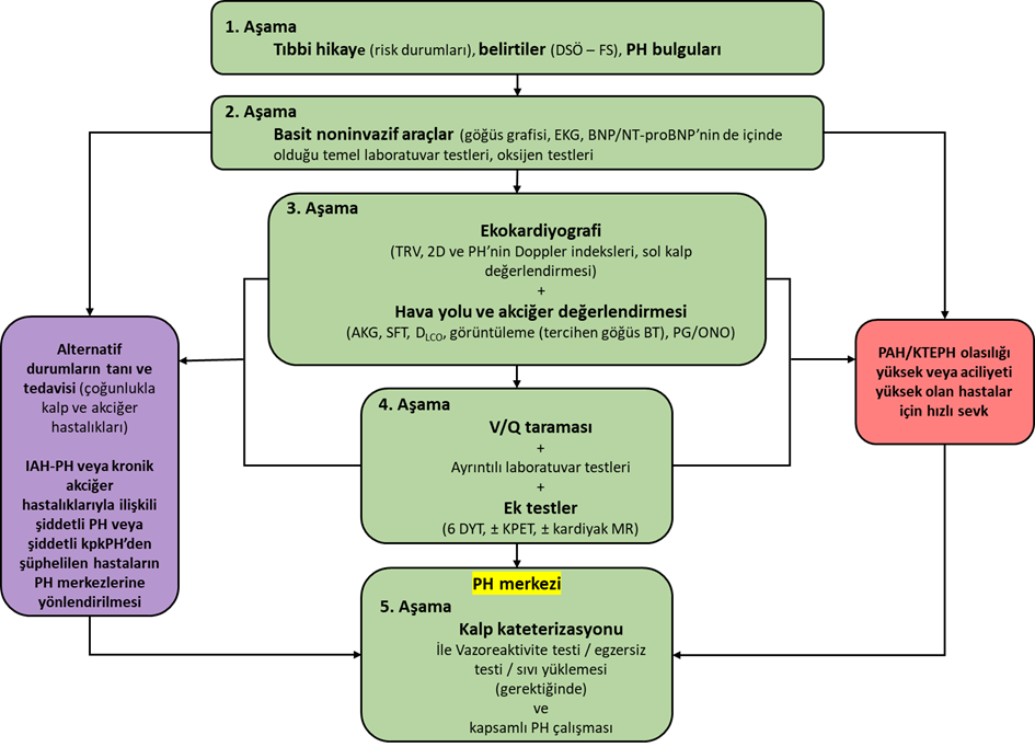 Açıklanamayan dispne ve/veya PH şüphesi uyandıran belirti/bulguları olan hastalarda çok aşamalı pragmatik bir tanı yaklaşımı düşünülmelidir.  Bu nedenle son zamanlarda basit, invazif olmayan araçlarla başlayıp, yaygın görülen kalp ve akciğer rahatsızlıklarının da değerlendirildiği, daha karmaşık tanı yöntemleriyle devam eden kademeli bir tanı algoritması benimsenmiştir (şekil 1)4.