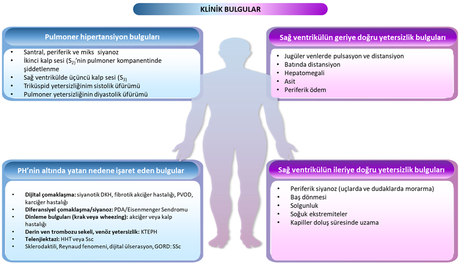 Öyküde PH ile ilişkili risk faktörlerine ait (örneğin bağ dokusu hastalığı, portal hipertansiyon, HIV, konjenital kalp bozuklukları, tromboembolik hastalık, sol kalp hastalıkları, akciğer hastalıkları ve uyuşturucu kullanımı) bulgulara özel dikkat gösterilmelidir. Kapsamlı bir fizik muayenede, belirgin ikinci kalp sesi ve daha ileri aşamada ise triküspit yetmezliğine bağlı sistolik üfürüm veya pulmoner kapak yetersizliğine bağlı diyastolik üfürüm (Graham Steell üfürümü) tespit edilebilir. Özellikle periferik ödem, genişlemiş ve pulsatil juguler venler, hepatomegali veya asit gibi belirtiler ciddi sağ kalp yetersizliği ile ilişkili olabileceği unutulmamalıdır (şekil 3)5.