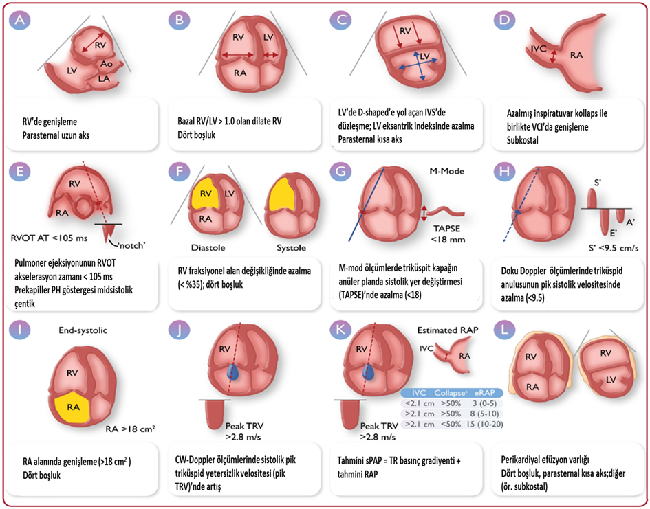 Özellikle sol ventrikül fonksiyonlarının değerlendirilmesinde [düşük ejeksiyon farksiyonlu kalp yetersizliği (DEFKY), korunmuş ejeksiyon farksiyonlu kalp yetersizliği (KEFKY), kapak kalp hastalığı ya da kardiyomiyopati] prognostik bilgiler sağlar. Ayrıca tepe triküspit regurgitasyon hızına (TRV) dayalı tahmini sistolik pulmoner arter basıncı ve PH’yi düşündüren ek bulguların analizi, ekokardiyografik PH olasılığının tahmin edilmesini sağlar (şekil 5, tablo 3). TRV’nin > 3,4 m·s −1, olması, PH’nin ekokardiyografik ek belirtilerinden bağımsız olarak, yüksek bir PH olasılığını düşündürür. 2,9 – 3,4 m·s -1 arasındaki TRV değerleri, PH’nin orta düzeyde olasılığı ile ilişkilidir; ancak PH’nin daha fazla ekokardiyografik belirtisinin bulunması, yüksek PH olasılığı ile sonuçlanır. TRV’nin ≤2,8 m·s -1, olması düşük PH olasılığı ile ilişkilidir; ancak PH’nin daha fazla ekokardiyografik belirtisinin bulunması, PH olasılığını orta düzeye çıkarabilir (şekil 5)1,10,
