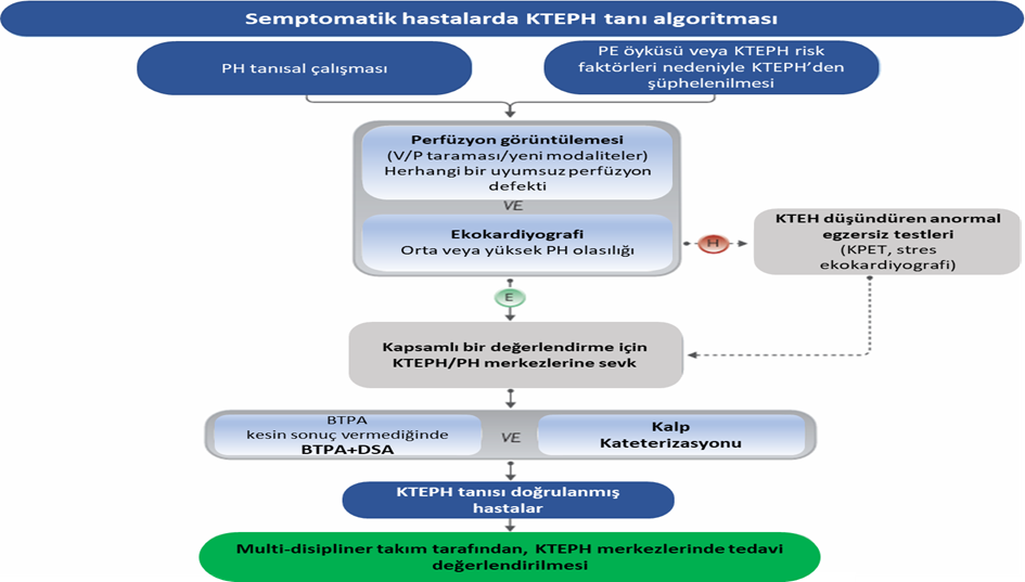 BTPA: Bilgisayarlı tomografi pulmoner anjiyografi , DSA: Dijital subtraksiyon anjiyografi , E: Evet, H: Hayır, KPET: Kardiyopulmoner egzersiz testi, KTEAH: Kronik tromboembolik akciğer hastalığı, KTEPH: Kronik tromboembolik pulmoner hipertansiyon, PE: Pulmoner embolizm, PH: Pulmoner hipertansiyon, V/Q: Ventilasyon/perfüzyon.