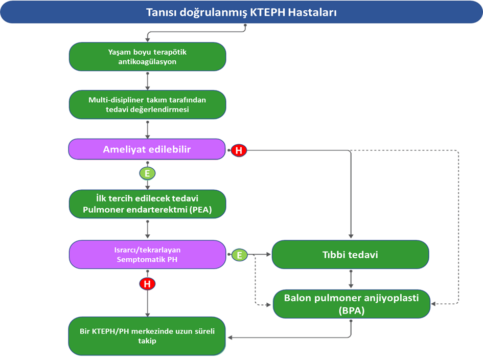 KTEPH: Kronik tromboembolik pulmoner hipertansiyon, PH: Pulmoner hipertansiyon, E: Evet, H: Hayır.